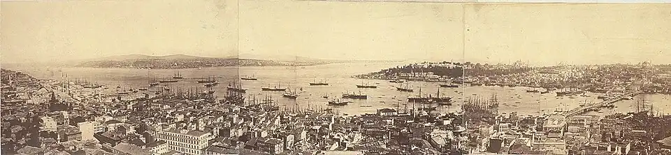 Desde a metade do século o centro da cidade moderna desloca-se progressivamente para o norte do corno, para além dos bairros de Gálata e Pera (Beyoglu), com a rua Istiklal como eixo e a Praça Taksim como foco Plano de ConstantinoplaLocalização do bairro Beyoglu[ligação inativa]. Para tal desenvolvimento precisavam-se pontes sobre do corno e, pela primeira vez em sua longa história (tinha tido projetos do sultão Bajazeto no século XVI inclusive com Leonardo da Vinci), duas tenderam-se em sucessivas estruturas ao longo do XIX.