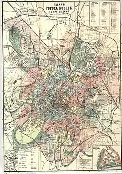 Situada em ambas as margens do homônimo rio Moskva, a cidade durante os séculos 16 a 17 cresceu em cinco divisões concêntricas, anteriormente separadas umas das outras por muros: o Kremlin ("fortaleza"), Kitaigorod ("cidade murada", mas interpretada como "Chinatown" pela etimologia popular ), Bielygorod ("cidade branca"), Zemlianoigorod ("cidade de terraplenagem") e Miestchanskygorod ("cidade burguesa") fora dos muros da cidade.