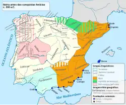 A idade do bronze da Península, com o desenvolvimento da olaria e outros metais como ouro e prata, iniciou-se cerca de 4 000 a.C. a sul, em locais como El Argar, de onde se espalhou.[7] No III milénio a.C., várias ondas de povos indo-europeus celtas vindos da Europa Central invadiram o território. Misturando-se com as populações locais, formaram diferentes grupos étnicos, com numerosas tribos.[7] As principais dessas tribos foram os galaicos, que estabeleceram a cultura castreja a norte, os lusitanos no centro, os célticos no Alentejo, e os cónios no extremo sul de Portugal (regiões do Algarve e Alentejo). Aí se desenvolveu a escrita do sudoeste, uma das escritas paleo-hispânicas. A sul, na mesma altura, estabeleceram-se também alguns postos comerciais costeiros semipermanentes de fenícios[7] e a partir do século V a.C. de cartagineses.[9]