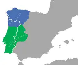 Em 711, um exército omíada de berberes e árabes recém convertidos ao islão liderados por Tárique,[32] desembarcou em Gibraltar após conquistar o norte de África.[33] Aproveitando-se das lutas internas que dividiam os visigodos ou chamados como aliados da facção de Ágila II, venceram a batalha de Guadalete contra as forças do rei visigodo Rodrigo. Rapidamente avançaram até Saragoça, beneficiando do povoamento disperso para conquistar quase toda a Península.[34] Ao território ocupado como província do Califado Omíada chamavam Alandalus. Ao oeste da Península, correspondente a Portugal, chamavam o Algarbe Alandalus ou simplesmente Al-Garb (o ocidente).[35]