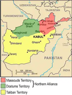 Após a queda de Cabul, Ahmad Shah Massoud e Abdul Rashid Dostum,[29] anteriormente arquiinimigos, criaram a Frente Unida (Aliança do Norte) contra os talibãs que estavam preparando ofensivas contra as demais áreas no âmbito do controle de Massoud e aquelas sob o controle de Dostum. A Frente Unida, incluído ao lado das forças de Massoud dominantemente tadjiques e as forças uzbeques de Dostum, facções hazaras e forças pashtuns sob a liderança dos comandantes, como Abdul Haq, Haji Abdul Qadir, Qari Baba ou o diplomata Abdul Rahim Ghafoorzai. Desde a conquista do Talibã em 1996 até novembro de 2001, a Frente Unida controlou cerca de 30% da população do Afeganistão, em províncias como Badaquistão, Capisa, Takhar e partes de Parwan, Kunar, Nuristão, Laghman, Samangan, Kunduz, Ghor e Bamiã.
