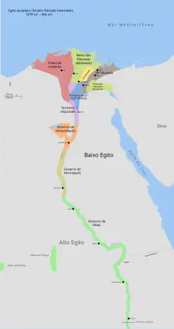 Livres de sua lealdade ao faraó, os governantes locais começaram a competir uns contra os outros para o controle territorial e poder político. Até 2 160 a.C., os governantes de Heracleópolis controlavam o Baixo Egito, enquanto um clã rival, baseado em Tebas, a família de Intefe, assumiu o controle do Alto Egito. Como os Intefes cresceram em poder e expandiram seu controle para o norte, um confronto entre as duas dinastias rivais tornou-se inevitável. Cerca de 2 055 a.C. as forças de Tebas sob Mentuotepe II, finalmente derrotaram os governantes de Heracleópolis, reunindo as Duas Terras e inaugurando um período de renascimento econômico e cultural conhecido como o Império Médio.[28]