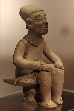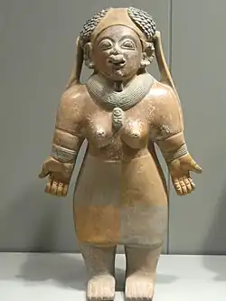 Na cultura La Tolita, houve uma enorme produção de estatuetas cerâmicas, de um tamanho entre 7 e 20 centímetros, e as representações de homens com máscaras, grandes penteados e emblemas de poder foram muito freqüentes. Também são abundantes as representações de seres mitológicos definidos como “dragões” (metade homem, metade animal) quem devido às constantes referências do mundo felino (garras, dentes), adquiriam em ocasiões um aspecto de fera.[8] Em Bahia e em Jama-Coaque, personagens de maior tamanho representam complicados penteados semicirculares rematados em picos ou em dois grandes coques, carregados de elementos simbólicos e enfeitados com orelhas, narigueiras –que perfuravam o lóbulo da orelha e o septo nasal- e barbas postiças e “bezotes”, um enfeite que se colocavam debaixo do lábio.