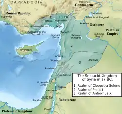 No norte, o sátrapa greco-iraniano Ptolomeu havia se declarado rei de Comagena em 163 a.C.,[116] enquanto os árabes abgaridas [en] governavam Osroena de forma independente desde 132 a.C.[117][118] A Revolta dos Macabeus na Palestina inaugurou o reino dos Asmoneus em 140 a.C.[119] Os nabateus, mais ao sul, mantiveram seu reino desde o século III a.C.[120] Isso fez com que os selêucidas se tornassem um estado fraco e vulnerável, limitado a partes da Síria e do Líbano.