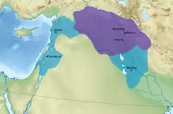 Após o colapso, grande parte da Síria foi dominada por tribos e estados arameus, que rapidamente se expandiram e se estabeleceram em toda a Síria, talvez incorporando remanescentes dos antigos amoritas e da Mesopotâmia.[66][67][68][69] A expansão pastoril dos arameus nas regiões assírias rapidamente os colocou em conflito com os assírios, cujo domínio na Alta Mesopotâmia, consequentemente, chegou ao fim (ca. 1 114 - 1 056 a.C.).[70][71] A infiltração arameia também se estendeu ao sul da Mesopotâmia, onde sua presença foi sentida pelas cidades da Babilônia central já no século X.[72] Alguns dos principais reinos arameus incluíam Arã-Damasco, Hamat, Bet-Adini [en], Samal, Bet-Bagyan [en], Arã-Zobá, Bet-Zamani [en] e Bet-Halupe [en].[66] No norte da Síria, a dispersão dos hititas e a expansão dos arameus deram origem a um conglomerado de reinos semíticos ocidentais e de língua anatólia conhecidos como estados sírio-hititas.[73][74][75][76]