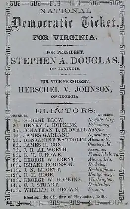 Na eleição de 1860, os democratas dividiram-se sobre a escolha do sucessor do presidente Buchanan, separando-se em linhas do Norte e do Sul.[48] Alguns delegados dos Democratas do Sul seguiram os Fire-Eaters [en] (Comedores de fogo) e abandonaram a Convenção Nacional Democrata [en] no Institute Hall, em Charleston, Carolina do Sul, em abril de 1860. Posteriormente, foram acompanhados por outros que, novamente liderados pelos Fire-Eaters, deixaram a Convenção de Baltimore em junho seguinte, quando a convenção rejeitou uma resolução que apoiava a extensão da escravidão a territórios cujos eleitores a rejeitavam. Os Democratas do Sul, também chamados de Secessionistas, indicaram John C. Breckinridge, de Kentucky, vice-presidente em exercício pró-escravidão, para presidente, e o general Joseph Lane [en], ex-governador do Oregon, para vice-presidente.[49] Os Democratas do Norte indicaram Douglas, de Illinois, para presidente e o ex-governador da Geórgia Herschel Vespasian Johnson [en] para vice-presidente, enquanto alguns democratas do Sul aderiram ao Partido da União Constitucional [en], apoiando o ex-senador John Bell, do Tennessee, para presidente, e o político Edward Everett, de Massachusetts, para vice-presidente. Essa fragmentação deixou o Partido Democrata impotente.[50]