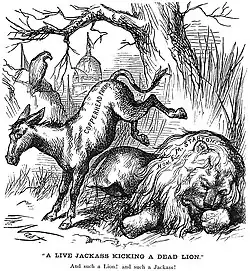 Nas eleições de 1866 [en], os Republicanos Radicais conquistaram maiorias de dois terços no Congresso e assumiram o controle dos assuntos nacionais. As grandes maiorias republicanas deixaram os democratas no Congresso impotentes, embora eles se opusessem unanimemente às políticas de Reconstrução dos radicais. O Senado aprovou a 14ª Emenda por 33 votos a 11, com todos os senadores democratas contrários.[53] Percebendo que as velhas questões os prejudicavam, os democratas tentaram uma "Nova Partida [en]", minimizando a guerra e enfatizando temas como o combate à corrupção e a supremacia branca, que apoiavam integralmente.[54]