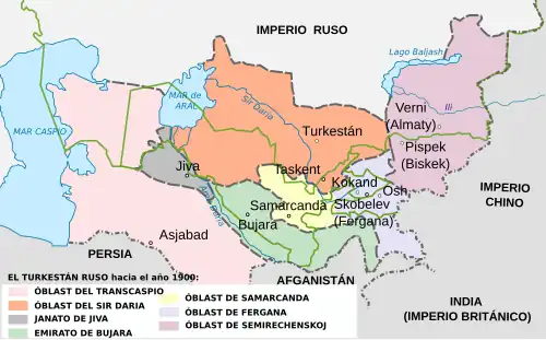 Em 1868, quando as tropas russas ocuparam Khujand, a principal cidade do norte, porta de entrada para o fértil vale de Fergana, o Emir se declarou vassalo do czar. A queda do canatos de Kokand e Bukhara entre 1873 e 1876 levou à colonização de um vasto território, que foi declarado um protetorado. A conquista acabou em 1895 com a anexação dos principados Pamir. O vale do rio Panj, que atualmente marca a fronteira com o Afeganistão, em seguida, determinou o limite sul da influência russa.