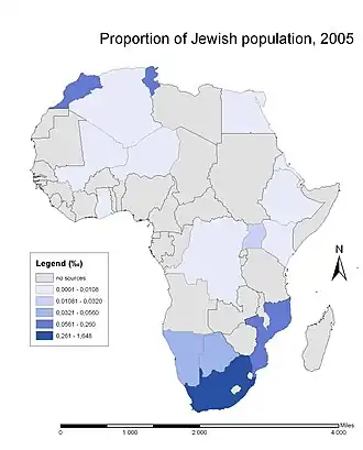 - África do Sul tem uma comunidade judaica importante de 75 555 pessoas. Representavam 0,2 % da população em 2014, e reduziram-se com respeito a 2001, quando representavam 0,3 % da população da África do Sul.[3][4] São sobretudo asquenazim. Eles e seus antepassados migraram em sua maioria da Lituânia antes da Segunda Guerra Mundial. Alguns também migraram da Grã-Bretanha, Alemanha e Europa oriental. Em menor medida, judeus sefaradim, procedentes principalmente da ilha de Rodes, também se estabeleceram na África subsaariana, em territórios como o Congo Belga. Posteriormente, os membros destas comunidades judaicas migraram à África do Sul.