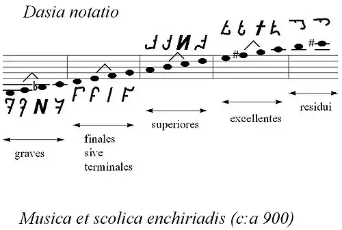- ↑ Notação dasiana é um tipo de notação musical que foi utilizada no século IX em tratados musicais anônimos.