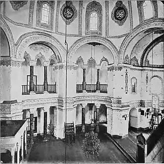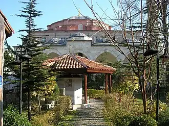 ![]() Vista da entrada (fachada ocidental) e do jardim da külliye (complexo religioso) no qual a mesquita, antiga igreja, está integrada. | |