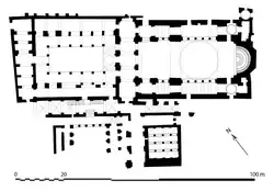 A igreja tem umas dimensões de 100 m x 32 m. Possui uma planta basilical romana consistente em uma nave central com duas laterais dividas por colunas e pilares. Completam a estrutura o nártex, galerias e átrio. A cúpula tem um diâmetro de 15 metros e uma altura de 35 metros com 20 janelas.