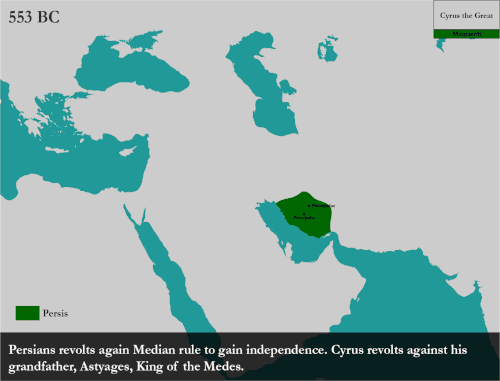 Em algum ponto em 550 a.C., Ciro, o Grande liderou uma rebelião contra o Império Medo, provavelmente devido à má administração feita pelos medos na Persis, derrotando-os e conquistando-os na sequência e criando o primeiro império persa. Ciro utilizou sua engenhosidade tática,[24] bem como sua compreensão das equações sociopolíticas que governavam seus territórios, para incorporar ao seu império os territórios vizinhos dos impérios lídio e neobabilônio, abrindo caminho para que seu sucessor, Cambises II, se aventurasse no Egito e derrotasse o Reino do Egito.