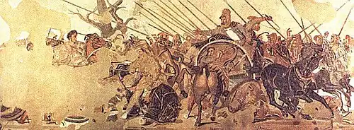 Batalha de Isso, entre Alexandre, o Grande (sobre o cavalo, à esquerda), e Dario III (sobre o veículo à direita), representada num mosaico em Pompeia que data do século I d.C.; Museu Arqueológico Nacional de Nápoles, Itália