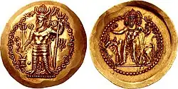 Por volta de 370, no entanto, no final do reinado de Sapor II, os sassânidas perderam o controle de Báctria para os invasores do norte: primeiro os quidaritas, depois os Heftalitas e finalmente os hunos alconos, que seguiriam com a invasão de Índia.[37] Esses invasores inicialmente emitiram moedas com base em desenhos sassânidas.[38] Várias moedas cunhadas em Bactria e baseadas em desenhos sassânidas ainda existem, muitas vezes com bustos imitando os reis sassânidas Sapor II (r. 309 a 379) e Sapor III (r. 383 a 388), adicionando o tanga alcono e o nome "Alcono" em Escrita bactriana no anverso e com atendentes a um altar de fogo no verso.[39]
