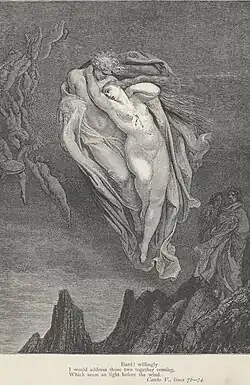 Logo depois está o Vale dos Ventos, onde padecem os luxuriosos, que sofrem e blasfemam contra Deus, enquanto são atormentados e arrebatados por um furacão e turbilhões de vento que não param nunca, arrastando os espíritos com violência, atormentando-os, ferindo-os e rolando-os. Em vida, eles eram levados por suas paixões, que os arrastavam como o vento; agora é o vento incessante que os arrasta no inferno. Aqui estão Semíramis, Cleópatra, Helena, Aquiles, Páris, Tristão e "mais mil almas que foram desfeitas pelo amor". Aqui também está Francesca de Rimini e seu amante Paulo Malatesta, que é seu cunhado. É descrito no Canto 5.