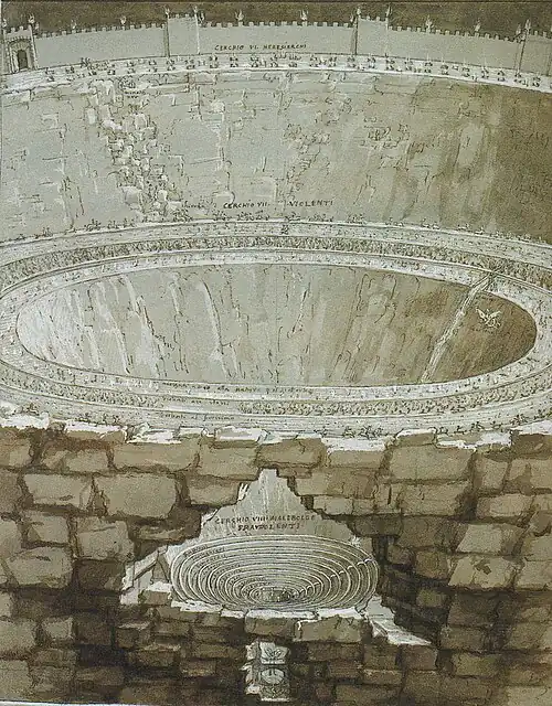 No fim do sexto círculo há um alto precipício circular (de onde vem um terrível cheiro) que leva ao sétimo círculo, onde estão os violentos, que distribuem-se por três vales (ou giros). No canto 11, Virgílio descreve a justiça do inferno. O sétimo círculo é descrito do canto 12 ao canto 17, cada canto descrevendo um vale e os últimos três a cachoeira.