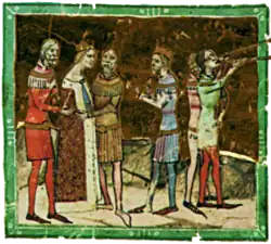 A rainha com os filhos em ilustração do século XIV, presente na Crônica Iluminada. | |||||