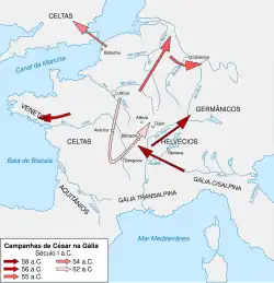 César estava atolado em dívidas, mas como governador podia ganhar muito dinheiro, especialmente através de extorsão e aventuras militares. Seu objetivo não era só ganhar dinheiro, mas conseguir glória nos campos de batalha; anexar novos territórios a Roma também lhe traria ganhos políticos e o respeito do povo.[69] Possuía quatro legiões sob seu comando e duas províncias que tinham fronteira com territórios não conquistados. A região mais vulnerável era a Gália, profundamente dividida e instável e habitada por tribos com vocação guerreira, que no passado já haviam derrotado Roma em combate. O pretexto para a invasão romana veio quando tribos gálicas aliadas a Roma foram derrotadas por rivais, estes apoiado por guerreiros germânicos, na batalha de Magetóbriga. César usou o receio de que estas tribos tentassem migrar para regiões próximas à península Itálica e que tivessem intenções belicosas para justificar uma incursão militar na Gália. César então recrutou mais legiões e derrotou estas tribos em batalha na fronteira do império.[70][71][72]