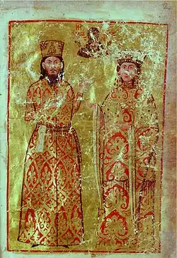 ![]() Йоан Синадин и съпругата му Теодора. Миниатюра от Устава на Теодора Синадина. | |