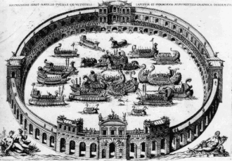 Tito de repente encheu este mesmo cenário com água e trouxe cavalos e touros e alguns outros animais domesticados que tinham sido ensinados para comportar-se no líquido elemento de modo igual do que em terra. Também trouxe pessoas em navios, que se confrontaram numa batalha naval, representando os Corciranos contra os Corintos; e outros deram uma exibição similar fora da cidade no arvoredo de Caio e Lúcio, o lugar que Augusto uma vez escavou para este mesmo propósito.[12]