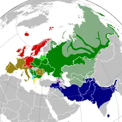 Em azul: Países onde a língua oficial é uma língua indo-europeia. Em azul claro: Países onde uma língua indo-europeia é reconhecida como língua de minoria