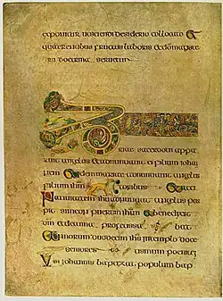 A decoração das primeiras palavras de cada Evangelho é primorosamente trabalhada. As páginas correspondentes, de fato, parecem tapetes decorados: as ilustrações são tão elaboradas que o texto torna-se ilegível. A página de início do Evangelho segundo Mateus (veja acima o fólio 29º), é um exemplo: só tem duas palavras, Liber generationis (o livro da geração). O lib de Liber transformou-se em um monograma gigante que domina toda a página. O er de Liber está representado por um entrelaçado de ornamentos com o b do monograma lib. A palavra Generationis estende-se por três linhas diferentes inserindo-se em uma moldura sofisticada à direita inferior da página. Todo o conjunto está agrupado por um elegante ribete. Este ribete e as mesmas letras estão ainda decoradas com espirais e arabescos, muitos deles zoomorfos. As primeiras palavras do Evangelho de Marcos, Initium evangelii (Início do Evangelho, veja ao lado) e do de João, In principio erat verbum (No princípio era o Verbo), foram objeto de tratamentos semelhantes. Estas ornamentações, ainda que particularmente mais trabalhadas no Livro de Kells, são encontradas em todos os evangeliários das ilhas britânicas.
