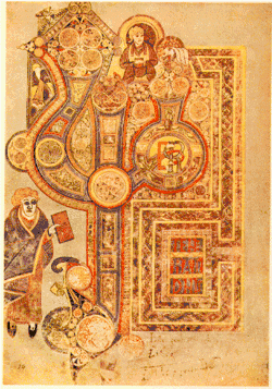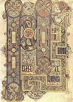 Os ornamentos do Livro de Kells podem chegar a alcançar uma complexidade assombrosa, como mostra este detalhe do monograma da Encarnação (fólio 34º)