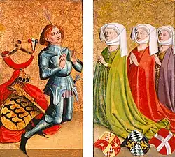 ![]() Representação de Margarida e Ulrico, que também mostra as outras duas esposas anteriores do conde, Margarida de Cleves e Isabel da Baviera-Landshut. | |||||