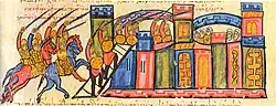 Durante o final do século IX e ao longo do século X, enquanto o Califado se fraturava em estados mais pequenos e o poderio árabe enfraquecia, os Bizantinos empreenderam uma série de campanhas vitoriosas contra eles.[69] Esta "reconquista bizantina" foi supervisionada pelos soberanos competentes da dinastia macedónica (867–1056) e marcou o zénite do estado bizantino.[70][71]