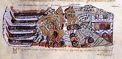 A Oriente, o estratego Basílio Hexamilita infligiu pesada derrota à frota de Tarso em 956, abrindo caminho para nova grande expedição recuperar Creta.[98] O comando dessa expedição foi entregue a Nicéforo Focas (futuro Nicéforo II), que em 960 zarpou com armada de 100 drómones, 200 quelândios e 308 navios de transporte, transportando uma força que totalizava 200 000 homens, para subjugar a ilha.[104] A conquista de Creta livrou o Egeu, a principal zona naval bizantina, a ameaça direta; as operações subsequentes de Focas conduziram à reconquista da Cilícia (em 963), do Chipre (em 968),[105] e da costa norte da Síria (em 969).[106]