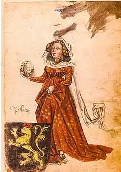 ![]() Representação de Matilde em 1459 do Códice de Ingeram feito para o seu segundo marido, Alberto VI da Áustria. | |||||