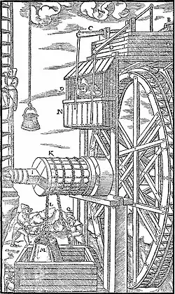 As rodas d'água datam do antigo Império Romano, e eram usadas para moer grãos e levantar água para irrigação. Por volta do século XIII, rodas d'água moviam serrarias, bem como a força hidráulica era empregada para puxar tecidos e linho, e mais tarde trapos de algodão para fazer tecidos. Martelos de viagem são mostrados triturando minério em De re Metallica (1555).[6]