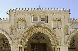 No topo do arco do mirabe há uma longa inscrição em ouro que liga diretamente a Mesquita de al-Aqsa com a Jornada Noturna de Maomé (o isra e o mi'raj) da "masjid al-haram" à "masjid al-aqsa".[63] Marcou a primeira vez que este versículo corânico foi inscrito em Jerusalém, levando Grabar a levantar a hipótese de que foi uma ação oficial dos fatímidas para ampliar o caráter sagrado do local.[57] A inscrição dá crédito a al-Zahir pela renovação da mesquita e a duas figuras desconhecidas, Abu Aluácime e um xarife, Haçane Huceini, pela supervisão do trabalho.[63][f]