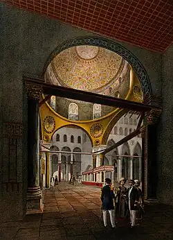 ... a mesquita é toda ladeada por mármore colorido... A maqsura [ou espaço reservado para os funcionários] fica de frente para o centro da parede sul [da Mesquita e da Área Haram] e é de tamanho suficiente para conter dezesseis colunas. Acima ergue-se uma poderosa cúpula ornamentada com esmalte.[65]