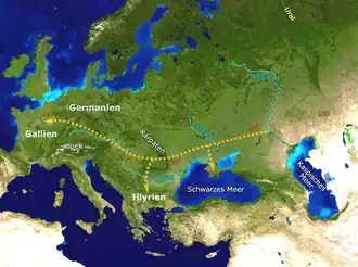 O avanço dos Hunos para oeste, das estepes da Ásia Central até à Germânia; e do Danúbio ao mar Báltico