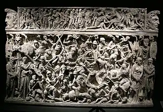 Sarcófago de Portonaccio, de um general romano envolvido nas campanhas de Marco Aurélio, representa a batalha entre romanos e germânicos, 180-190 dC.