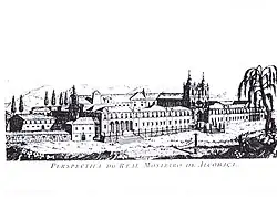 O mosteiro é constituído por uma igreja ao lado da sacristia e, a norte, por três claustros seguidos, sendo cada um circundado, na sua totalidade, por dois andares, assim como também por uma ala a sul. Os claustros, inclusive o mais antigo, possuem, igualmente, dois andares. Os edifícios à volta dos claustros mais recentes possuem três andares. Entre 1998 e 2000 foi descoberto um presumível quarto claustro no lado sul da igreja. Este claustro foi, provavelmente, aplanado na sequência da destruição causada pelo terramoto de 1755 e da grande inundação de 1774. Também é possível que os vestígios dos habitantes da ala sul tenham sido eliminados em 1834. O edifício completo ainda hoje possui uma área de construção de 27 000 m² e uma área total de pisos de 40 000 m². A área construída, juntamente com o claustro sul, terá tido a dimensão de 33 500 m². A fachada principal do mosteiro, da igreja e da ala norte e sul tem uma largura de 221 m, tendo o lado norte ca. de 250 m.