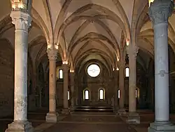 Com uma planta em cruz latina, a concepção arquitetónica deste monumento, desprovido, no interior, de decoração e sem imagens, como ordenava a Ordem de Cister, apresenta uma grandiosidade e beleza indiscutíveis. As naves central e laterais, inteiramente abobadadas, são praticamente da mesma altura, dando a sensação de amplo espaço, a que o processo de iluminação, românico ainda, dá pouca luz e o torna maior. As naves laterais prolongam-se pelo deambulatório, e da charola irradiam nove capelas que acompanham a abside circular, iluminada por frestas altas, o que realça o altar-mor. A segurar a parte alta da abside existem arcos-botantes, pouco vulgares nas abadias de Cister, talvez por ser um monumento de transição entre o românico e o gótico. As inovações típicas da arte gótica aparecem ainda com o aspecto de um ensaio, como por exemplo a subida das naves laterais até à altura da central. O transepto apresenta-se com duas naves, mas quando olhamos a planta da igreja, reconhecem-se três, nos alicerces e no corpo central.