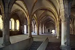 A oeste e ao lado da nova cozinha encontra-se o Refeitório, constituído por uma sala com três naves, com as dimensões de ca. de 620 m² (29 x 21,5 m). Por cima da entrada encontra-se uma inscrição em latim de difícil interpretação: respicite quia peccata populi comeditis (lembrem-se que estão a comer os pecados do povo). A sala impressiona pelas suas proporções harmónicas, possuindo janelas tanto do lado norte como a leste. Do lado oeste, uma escada de pedra conduz ao púlpito do leitor, que lia textos espirituais durante as refeições. Os monges sentavam-se com os rostos virados uns para os outros e tomavam a sua refeição em silêncio. O abade estava sentado com as costas viradas para a parede a norte. No lado oeste da ponta a sul, o Refeitório abria-se para a antiga cozinha medieval, hoje uma sala lateral, que conduz ao claustro de D. Afonso VI. Alguns metros à frente, encontra-se na mesma parede uma abertura de dois metros de altura e 32 cm de largura, que conduz à sala, não existindo nenhuma explicação para ela. A estreita porta, ao contrário do que se pensa, servia como meio de ligação para com o exterior do mosteiro, para passar refeições aos pobres. Os danos causados pela transformação em 1840 do Refeitório num teatro foram remediados durante a sua restauração.
