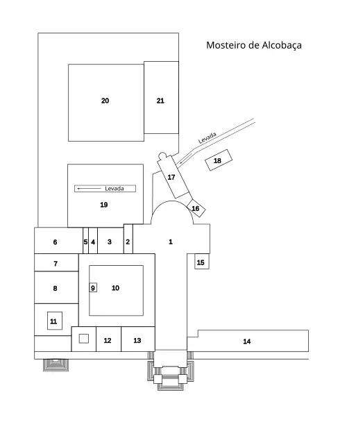 - ↑ Planta elaborada com o auxílio de dados de: Dom Maur Cocheril: Alcobaça, Abadia Cisterense de Portugal. Alcobaça, 1989, Depósito Legal 30 258/89