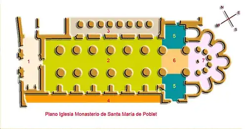 Tem planta basilical com três naves e cruzeiro; as duas laterais são bem mais estreitas que a central. A nave norte (encostada ao claustro) (nº 3 em plano) é românica com abóbada em cruzaria; a nave central (nº 2 em plano) é também românica, mas a sua abóbada é de canhão apontado; a nave sul é gótica, reconstruída pelo abade Copons por volta de 1330, ao mesmo tempo em que mandou abrir as sete capelas (nº 4 em plano); também é de tempo deste abade o grande zimbório gótico, octogonal e de grandes vitrais, que foi restaurado entre 1979 e 1981. Ao redor do presbitério discorre a charola (nº 7 em plano) à qual se abrem cinco capelas radiais. As duas absidais das esquinas têm comunicação com o cruzeiro (nº 5 em plano).