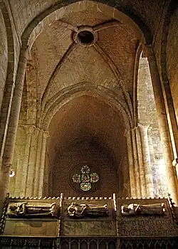 - Joana de Aragão, condessa de Ampúrias, filha de Pedro IV, falecida em 1384, enterrada num sarcófago de pedra gótico policromado (ficam restos de policromia). Fica simétrico ao sepulcro de Martim o Humano, ao outro lado do cruzeiro, sobre uma fonte ou lavabo.