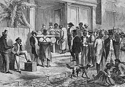 No entanto, a partir de 1868, as eleições em muitos estados do Sul passaram a ser cada vez mais marcadas por violência para suprimir o voto dos negros. Clubes de rifles tinham milhares de membros. Em 1874, surgiram grupos paramilitares, como a Liga Branca e os Camisas Vermelhas, que trabalhavam abertamente para usar intimidação e violência para reprimir o voto dos negros e desestabilizar o Partido Republicano, visando recuperar o poder político dos brancos nos estados do Sul.[16][18][19] Rable os descreveu como o “braço militar do Partido Democrata”.[20]