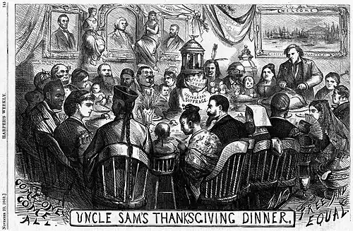 - ↑ Walfred, Michele (Julho de 2014). «Uncle Sam's Thanksgiving Dinner: Two Coasts, Two Perspectives». Thomas Nast Cartoons. Consultado em 9 de fevereiro de 2025. Cópia arquivada em 5 de março de 2016