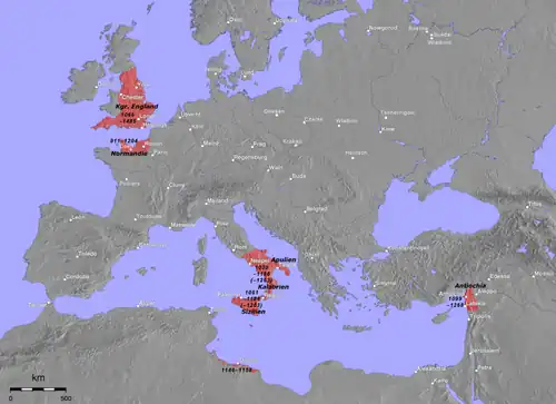 Os normandos se estabeleceram com sucesso também longe da Normandia. Quase contemporaneamente à conquista da Inglaterra, na segunda metade do século XI,[1] grupos de normandos se dirigiram ao sul da península Itálica e Península Ibérica (Roberto Burdet, a Tarragona)[carece de fontes], inicialmente como mercenários, motivados pela possibilidade que ofereciam as rebeliões antibizantinas na Apúlia.