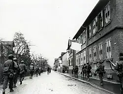 Tropas estadunidenses entram em Bensheim, o local do campo KZ Bensheim-Auerbach, Março de 1945