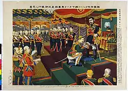 O Imperador Meiji recebendo a Ordem da Jarreteira do príncipe Artur de Connaught em 1906, como consequência da Aliança Anglo-Japonesa.
