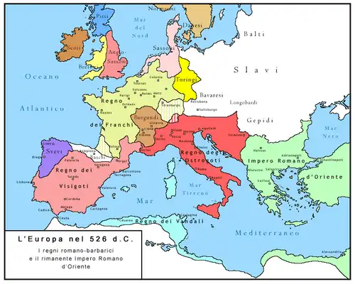 Após a morte de Teodorico, a 30 de agosto 526, as suas conquistas começaram a perder força. O sucessor de Teodorico foi o seu sobrinho recém-nascido Atalarico, protegido pela mãe Amalasunta como regente. A falta de um herdeiro forte levou a uma rede de alianças que levou o estado ostrogótico à desintegração: o reino Visigótico recuperou a sua autonomia sob Amalarico, as relações com os vândalos tornaram-se hostis e os francos iniciaram uma nova campanha expansionista subjugando os turíngios, os borgonheses e quase expulsando os visigodos da sua terra natal, o sul da Gália.[3] A posição de predominância que o reino ostrogótico adquiriu graças a Teodorico na Europa Ocidental passou agora para os Francos.