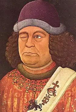 Em 1415, como embaixador de Sigismundo de Luxemburgo, ele obteve reconhecimentos solenes de Fernando I de Aragão da Ordem da Giara e do Grifo (Ordem de la Jarra e del Grifo) e da Ordem da Estola. No retrato, notamos o colar composto por potes contendo três lírios e com um pendente central representando um grifo. A estola no ombro mostra o broche com a jarra e os três lírios.